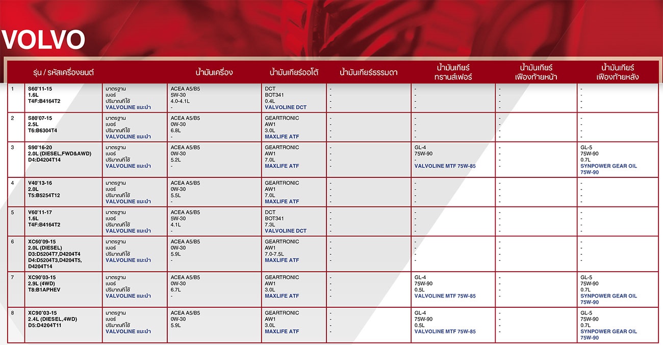 ตารางน้ำมัน VALVOLINE